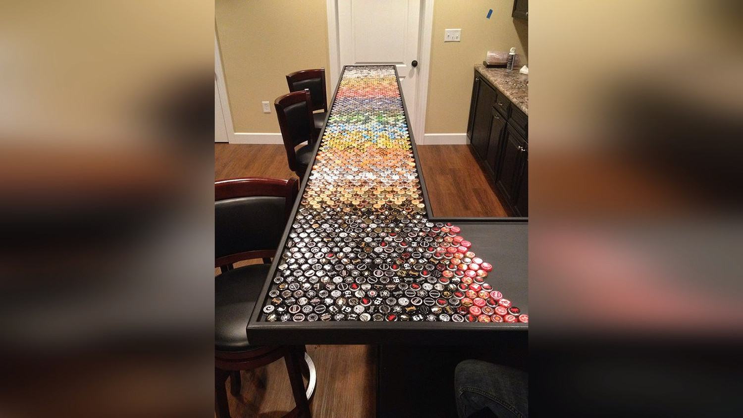 Визуально этот стол-стойка добавил кухне цвета и индивидуальности, а кроме того, рассматривание крышечек само по себе довольно увлекательное занятие, во время приема пищи. Супруге очень понравилось затея мужа, изначально она скептически отнеслась к идее, но когда она увидела то, что получилось, в итоге она не могла поверить своим глазам. Сам парень говорит, что для него одной из самых приятных вещей в доме является то, что вы сделали своими руками, демонстрируя тем самым свои интересы, ценности и индивидуальность. Такой столешницы нет ни у кого в целом мире, и это не может не радовать.