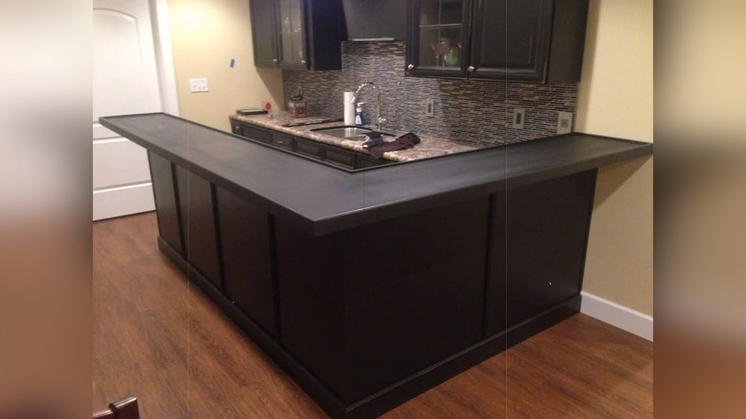 Случаи, когда в каких-то местах образовывались пузырьки воздуха, то они решали эту проблему с помощью строительного фена, который устранял пузырьки и выравнивал поверхность. Цвета Крис разместил таким образом, чтобы угол был сделан более темным, а если посмотреть сверху, видно, что цвета плавно перетекают друг в друга. Когда вся кропотливая работа была сделана и столешница была готова к использованию, друзья увидели перед собой вот такую красоту.