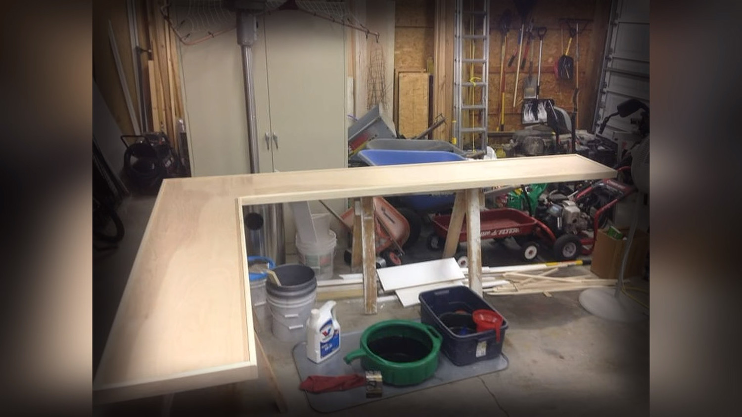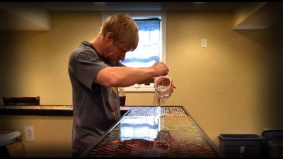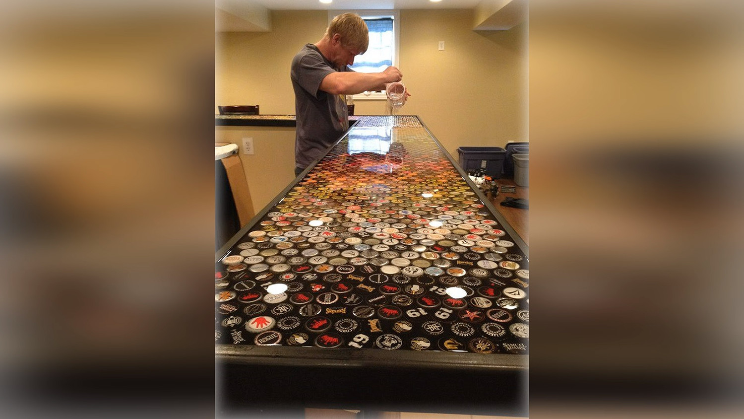 Когда столешница была установлена на кухне, парень тщательно выровнял поверхность, во избежание проблем при заливке эпоксидной смолой. После чего он начал осуществлять свою мечту, в этом нелегком деле мужчине помогли друзья, они тоже собирали для него металлические крышечки на протяжении нескольких лет, и не могли не поучаствовать в этом процессе.