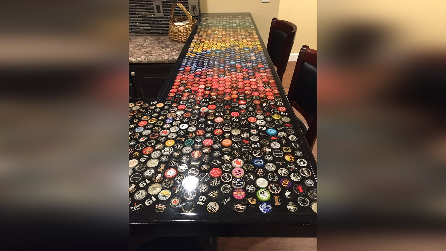 Одной из самых сложных задач было сортировка крышек по цветам, в этом участвовала вся семья, а также друзья. Несколько дней они старательно отбирали элементы, которые будут выгодно смотреться в разных цветовых гаммах, детям же это приносило удовольствие и восторг сначала. Крис спланировал сложить из них какой-то красивый рисунок, но затем пришёл к выводу, что если правильно разложить крышечки по цветам, то барная стойка на кухне будет выглядеть намного эффектнее.